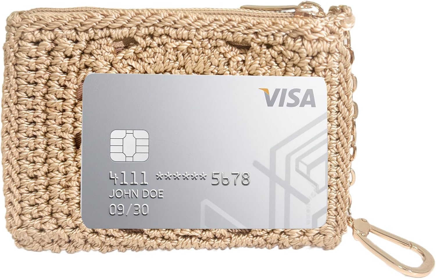 Eiyye Card Holder Wallet Handmade Crochet Small Wallet with Zipper Credit Card Holder for Coin Cards & Driver's License (Khaki)
