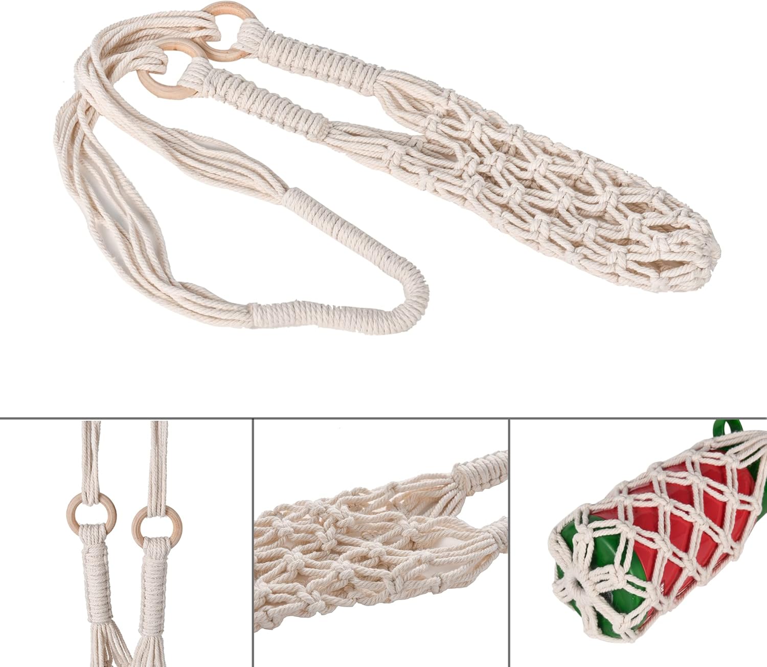 Stretches to fit: twist-crochet net fits bottles up to ~3.25" diameter.