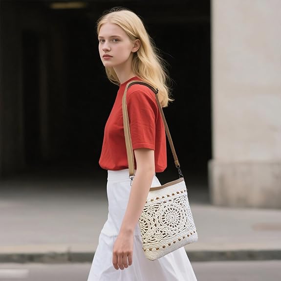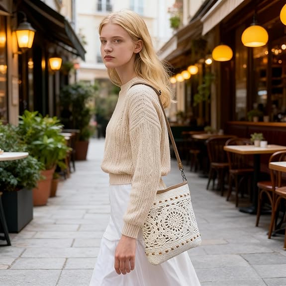 - Vintage Boho Style: Features intricate lace-like circular motifs and a natural neutral tone—effortlessly blending with sweaters, trench coats, and boots for a chic seasonal look.