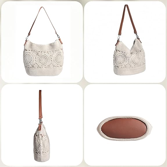 - Handwoven Cotton Crochet Bag: Made with high-quality polypropylene yarn, this lightweight purse features beautiful circular crochet patterns and a relaxed hobo silhouette. Includes a brown faux leather strap and zipper closure.